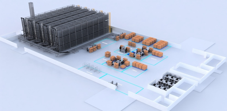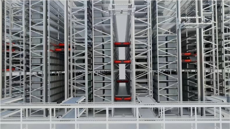 本次系统升级项目采用“立库货架+料箱穿梭车+提升机+自动化输送线”四位一体设计,辅以 AGV 无人搬运与 WMS 仓储管理系统联动运行,构建起覆盖入库、拣选、出库、配送全流程的一体化自动化体系。